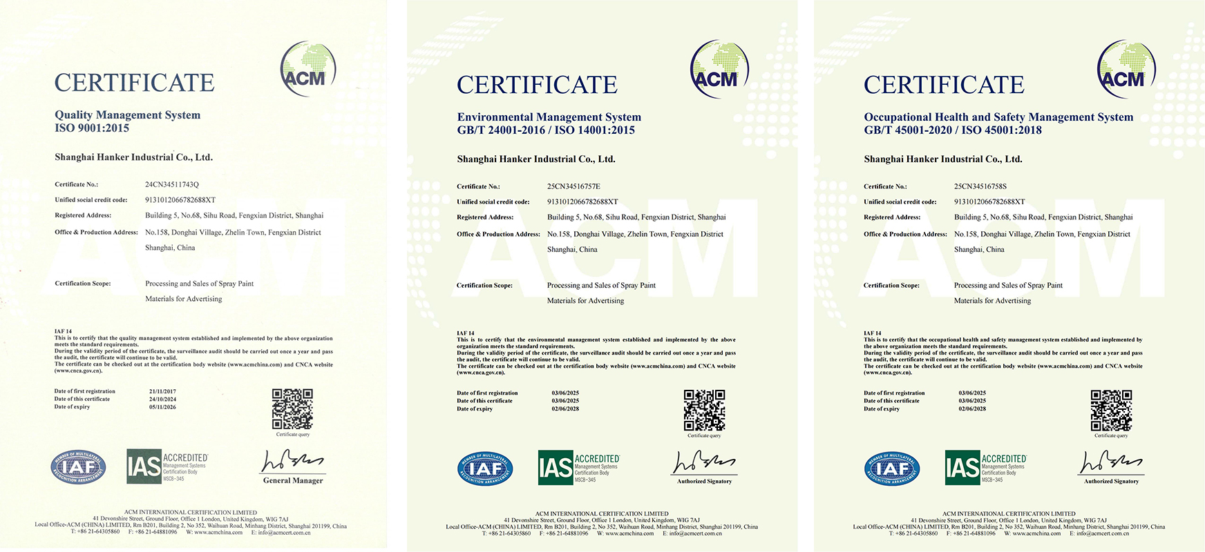 最近、Shanghai Hanker Industrial Co.、Ltd。(「Hanker」と呼ばれる)は、ISO 9001:2015品質管理システム認定、ISO 14001環境管理システム認証、ISO 45001 ACM International Certification Limitedの監査を通じて職業的健康と安全管理システムの認定に成功しました。この成果は、同社が品質管理、環境保護、従業員の安全性において国際基準を完全に満たしていることを示しています。これら3つのシステム認定の取得は、標準化された管理に対するハンカーの長期的なコミットメントの結果です。生産プロセスを最適化し、環境リスクの予防と制御メカニズムを確立し、労働安全衛生トレーニングシステムを改善することにより、同社は原材料調達から完成品の配達までチェーン全体を標準化した制御を達成しました。将来、これらの認定を財団として採用して、ハンカーは技術の革新と管理のアップグレードをさらに深め、大学との業界と大学との研究協力を積極的に促進し、材料分野で最先端のアプリケーションを探求し、業界の高品質開発に貢献します。